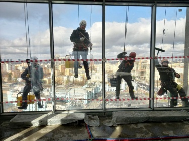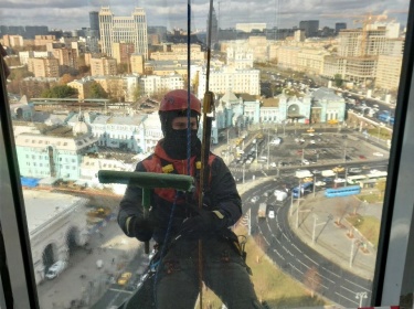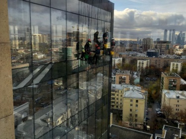 Фото и видео по кейсу: Мойка окон высотного здания в Москве. Клининговые работы выполнялись промышленными альпинистами на высоте более 50 метров.
