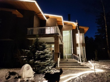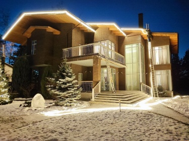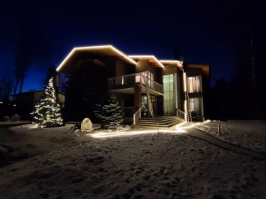 Фото и видео по кейсу: Монтаж неоновой подсветки в КП Антоновка. Тёплый белый неон. Нестандартная, высокая и ступенчатая крыша. Около 100 м. Два дня. Во второй день был подсвечен первый этаж